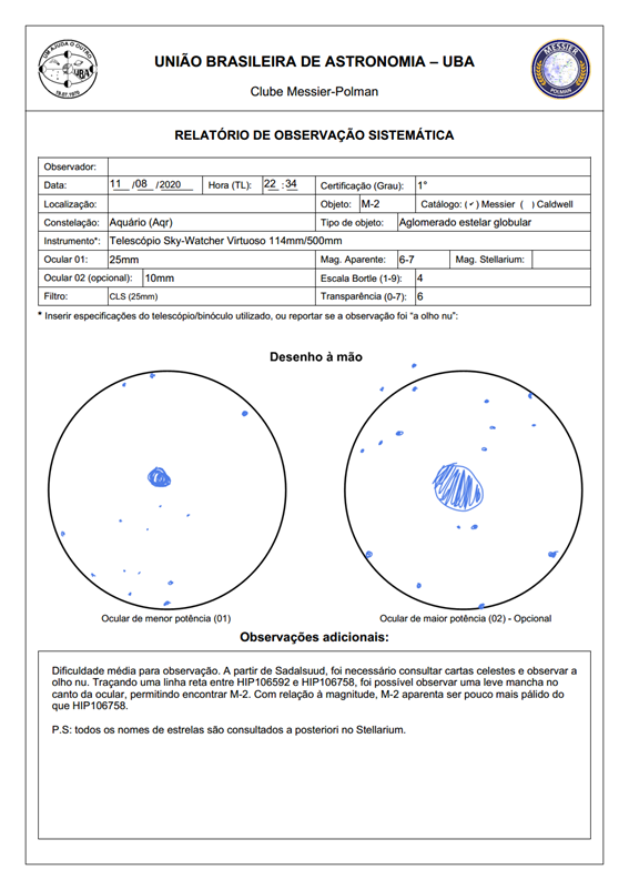 · Objeto: indique qual o objeto Messier que está sendo registrado (por exemplo: M-31, C-86 etc.);